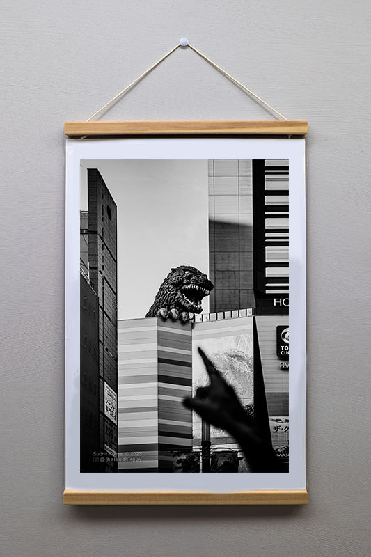 Select this option if you would like to order a matte, 13 by 19 inch print of the piece, "ゴジラ!" ("GODZILLA!") on Museum Etching paper, which is a superb, heavyweight museum-quality fine art paper that has a warm, natural white textured surface finish producing gorgeous, saturated colours and deep blacks. In this shot, a petrified bystander points at the terrifying monster that is famous for its anger and destruction.